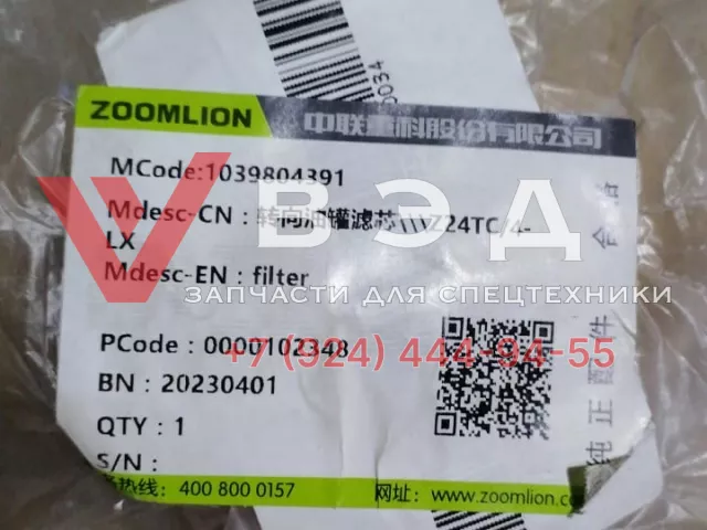 В наличии — Фильтр ГУР ZOOMLION 1039804391. Оригинальная запчасть. Применимость: Автокраны Zoomlion.